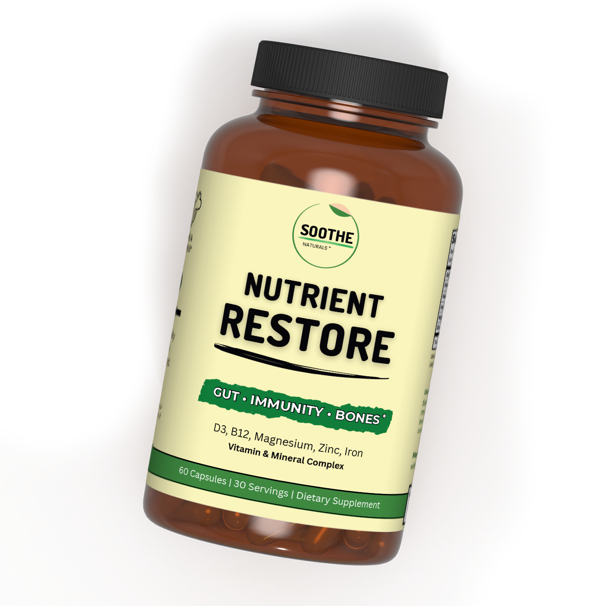 Nutrient Restore: Magnesium Glycinate, Vitamin B12, Vitamin D3, Iron, and Zinc Glycinate.