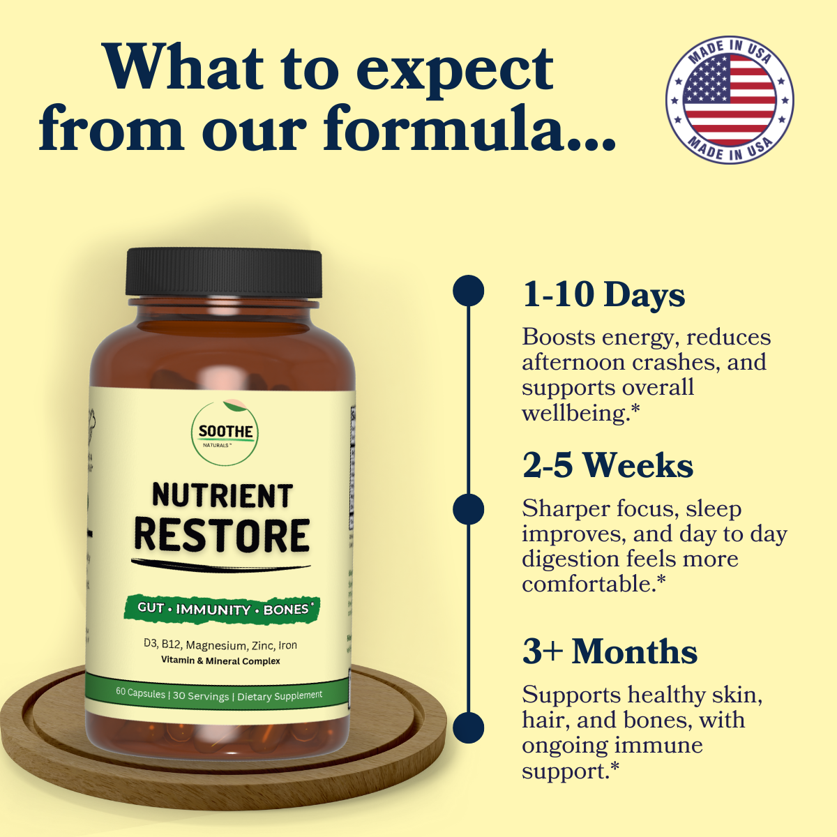 High quality magnesium glycinate, zinc glycinate, vitamin D3, vitamin B12, and iron, chosen for direct, noticeable support.