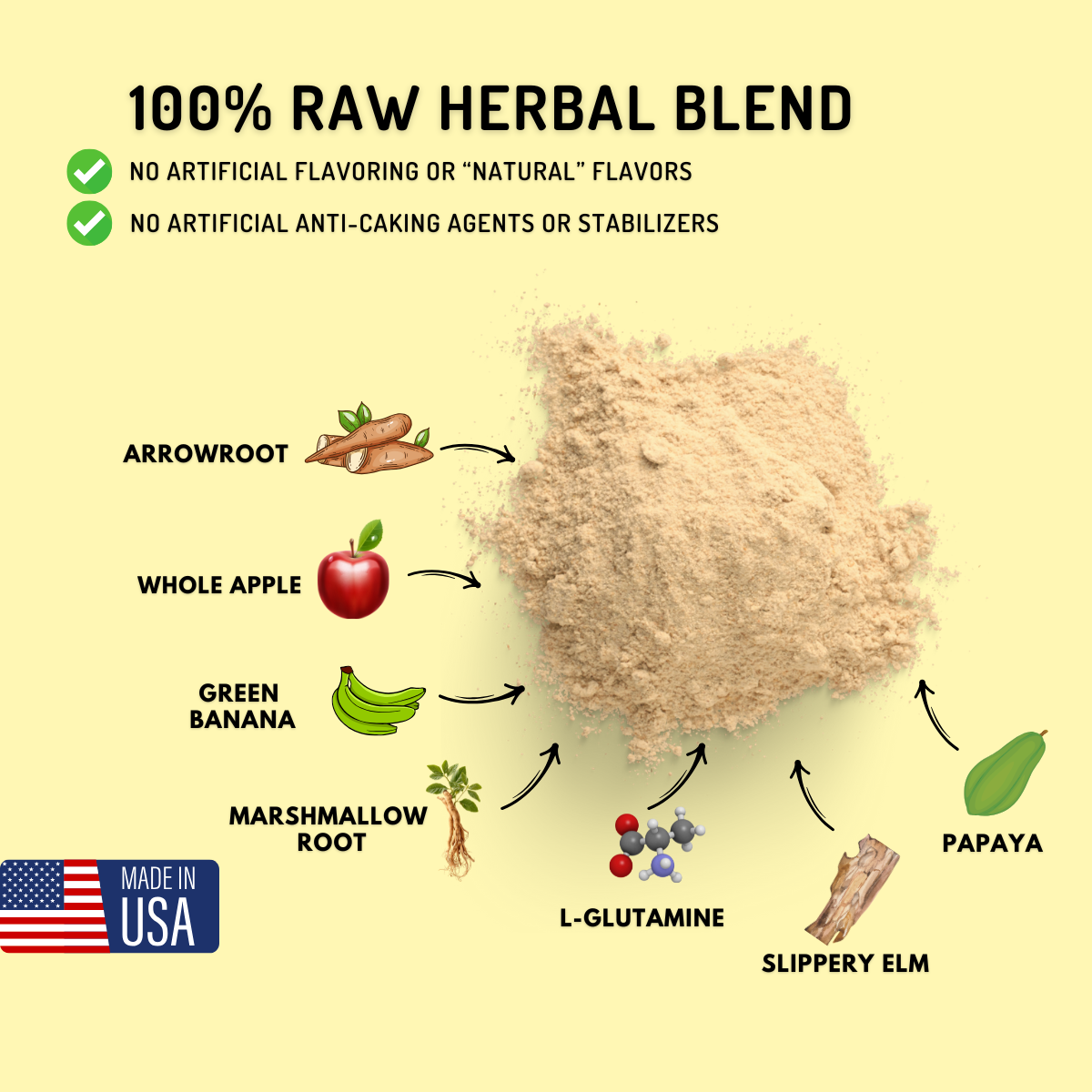 Stomach Soothe™ : Whole Apple (fruit), Green Banana (fruit), Arrowroot (root), L-Glutamine, Papaya (fruit), Slippery Elm (bark), Marshmallow (root)