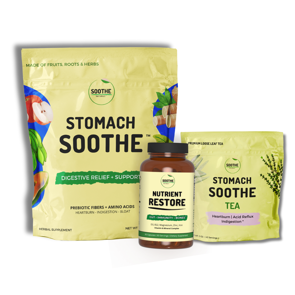 The Stomach Soothe Kit is designed to provide natural, soothing relief while supporting heartburn, bloating and indigestion, helping restore key nutrients and beneficial gut flora, and nourishing and supporting the GI lining for everyday digestive comfort.*